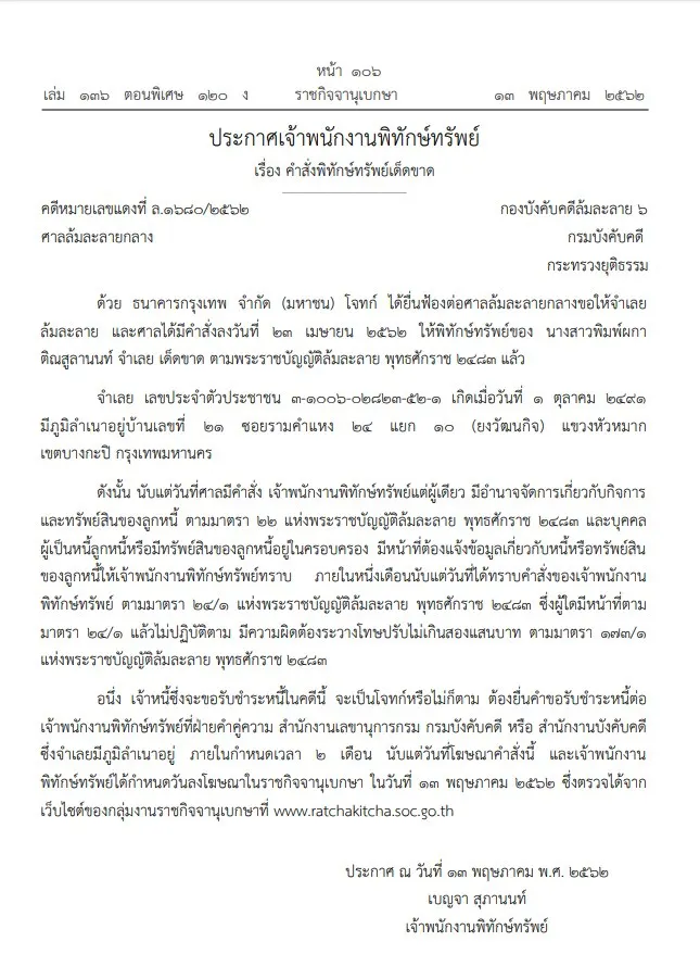 โดยระบุว่าประกาศเจ้าพนักงานพิทักษ์ทรัพย์ เรื่อง คําสั่งพิทักษ์ทรัพย์เด็ดขาด คดีหมายเลขแดงที่ ล.๑๖๘๐/๒๕๖๒ กองบังคับคดีล้มละลาย ๖ ศาลล้มละลายกลาง กรมบังคับคดี กระทรวงยุติธรรม ด้วย ธนาคารกรุงเทพ จํากัด (มหาชน) โจทก์ ได้ยื่นฟ้องต่อศาลล้มละลายกลางขอให้จําเลย ล้มละลาย และศาลได้มีคําสั่งลงวันที่ ๒๓ เมษายน ๒๕๖๒ ให้พิทักษ์ทรัพย์ของ นางสาวพิมพ์ผกา ติณสูลานนท์ จําเลย เด็ดขาด ตามพระราชบัญญัติล้มละลาย พุทธศักราช ๒๔๘๓ แล้ว จําเลย เลขประจําตัวประชาชน ๓-๑๐๐๖-๐๒๘๒๓-๕๒-๑ เกิดเมื่อวันที่ ๑ ตุลาคม ๒๔๙๑ มีภูมิลําเนาอยู่บ้านเลขที่ ๒๑ ซอยรามคําแหง ๒๔ แยก ๑๐ (ยงวัฒนกิจ) แขวงหัวหมาก เขตบางกะปิ กรุงเทพมหานคร