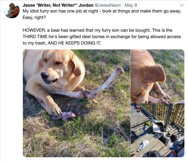 แต่แล้วเจ้าหมีกลับได้เรียนรู้ว่าลูกชายขนปุยของผมสามารถซื้อตัวได้ง่ายๆ และนี่เป็นครั้งที่สามที่เขาได้กระดูกกวางเป็นของขวัญ เพื่อแลกกับการอนุญาตให้เจ้าหมีเข้าไปลื้อถังขยะบ้านผม และมันก็ไม่คิดจะเลิกทำตัวอย่างนี้”