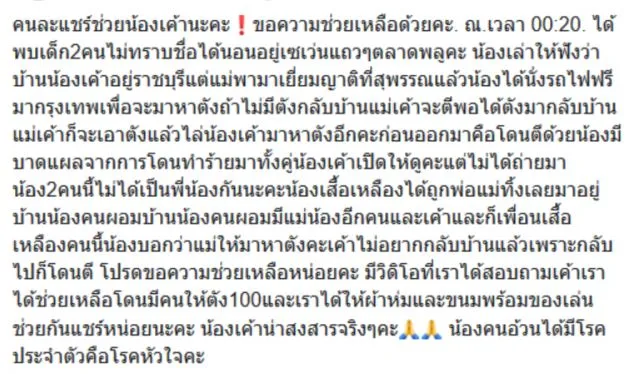 เป็นอีกหนึ่งเรื่องราวที่มีผู้คนร่วมแชร์เป็นอย่างมาก จากกรณีสมาชิกเฟซบุ๊กที่ใช้ชื่อว่า “Kullaya Yokyong” ได้มีการโพสต์เรื่องราวหลังจากที่ได้เจอเด็กน้อย 2 คนนอนอยู่ข้างร้านสะดวกซื้อแห่งหนึ่ง จึงได้เข้าไปช่วยเหลือและสอบถาม โดยเด็กทั้งสองคนเล่าว่าถูกบังคับให้ออกมาขอทาน หากไม่ยอมทำตามก็จะถูกทำโทษ ซึ่งผู้โพสต์ได้ระบุที่มาที่ไปว่า