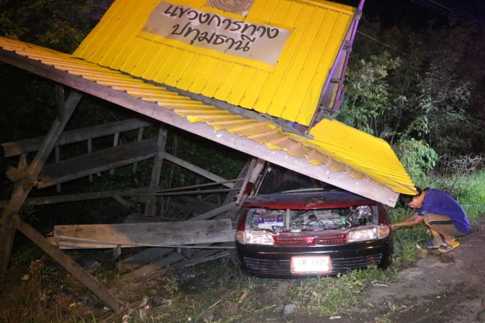 สองหนุ่มเมาซิ่งเก๋งแหกโค้งชนศาลาพักผู้โดยสารพัง