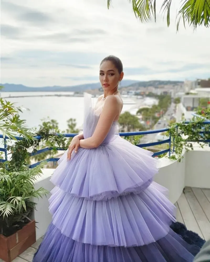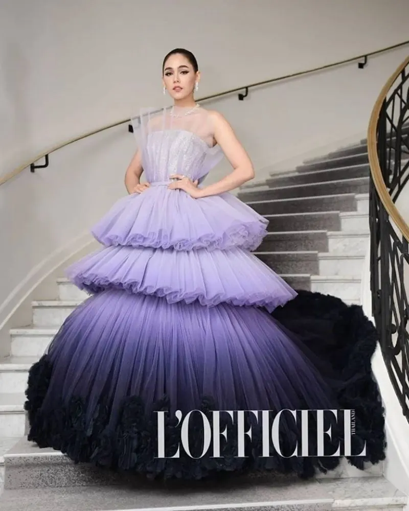 โดย ชมพู่ อารยา มาในชุดราตรีสวยหรูจากแบรนด์ Ralph & Russo Couture ผ้าทูลอัดพลีทสีม่วงไล่เฉดและแต่งเลเยอร์ 3 ชั้น ด้านในแต่งคริสตัล มาพร้อมเครื่องประดับเพชรจาก Chopard สร้อยคอเพชรหยดน้ำ รวมประมาณ 60 กะรัต มูลค่ากว่า 40 ล้านบาท