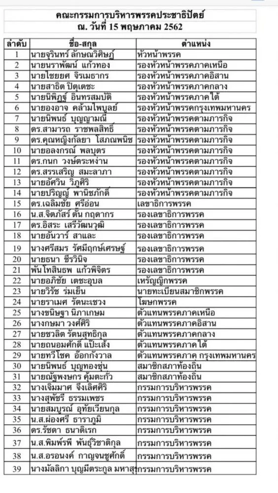 สำหรับรายชื่อกรรมการบริหารพรรคนวน 39 คน มีรายชื่อดังนี้