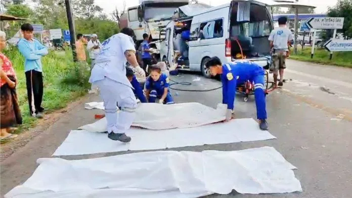 เมื่อวันที่ 15 พ.ค. ร.ต.อ.สุวิวัฒน์ นิติไกรสิทธิ์ รอง สว.(สอบสวน) สภ.ชุมแพ รับแจ้งเหตุรถชนกัน บนถนนชุมแพ สีชมพู แยกบ้านโสกก้อง ม.6 ต.วังหินลาด อ.ชุมแพ จ.ขอนแก่น หลังรับแจ้งจึงรุดไปตรวจสอบพร้อมหน่วยกู้ภัยจีแชเกาะ หน่วยกู้ชีพ อบต.หนองไผ่ และหน่วยกู้ชีพ อบต.วังหินลาด ที่เกิดเหตุบริเวณกลางถนนพบ รถตู้ ยี่ห้อโตโยต้า สีขาว ทะเบียน ฮท9476 กทม. สภาพด้านหน้าพังยับเยินชนอัดติดกับรถพ่วงบรรทุก ทะเบียนตอนหน้า 79-8553 กทม. ตอนท้าย 75-6562 กทม. ของบริษัท ผดุงฤทธิ์ขนส่ง จำกัด ภายในรถตู้มีผู้เสียชีวิตติดคาซากรถ 3 ศพ เจ้าหน้าที่ใช้เครื่องตัดถ่างช่วยนำร่างออกมาด้านนอกรถ และพบว่ามีศพกระเด็นอยู่บนถนนอีก 1 ราย เบื้องยังไม่ทราบชื่อ ส่วนคนเจ็บเจ้าหน้าที่เร่งนำส่งโรงพยาบาลชุมแพ 4 รายก่อนหน้า อาการสาหัส และทนพิษบาดแผลไม่ไหวเสียชีวิตในเวลาต่อมา อีก 1 ราย รวมผู้เสียชีวิต 5 ศพ บาดเจ็บสาหัส 3 ราย