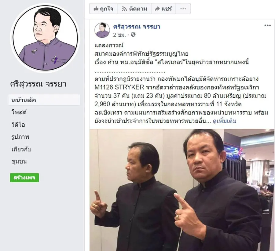 วันที่ 15 พ.ค.62 นายศรีสุวรรณ จรรยา เลขาธิการสมาคมพิทักษ์รัฐรรมนูญไทย ออกแถลงการณ์ค้าน ทบ.อนุมัติซื้อสไตรเกอร์ ในยุคข้าวยากหมากแพงนี้ ข้อความระบุว่า ตามที่ปรากฎมีรายงานว่า กองทัพบกได้อนุมัติจัดหารถเกราะล้อยาง M1126 STRYKER จากอัตราสำรองคลังของกองทัพสหรัฐอเมริกาจำนวน 37 คัน (แถม 23 คัน) มูลค่าประมาณ 80 ล้านเหรียญ (ประมาณ 2,960 ล้านบาท) เพื่อบรรจุในกองพลทหารราบที่ 11 จังหวัดฉะเชิงเทรา ตามแผนการเสริมสร้างศักยภาพของหน่วยทหารราบ พร้อมยังจะนำเข้าประจำการในหน่วยทหารหน่วยอื่นอีกด้วย ความดังทราบแล้วนั้น