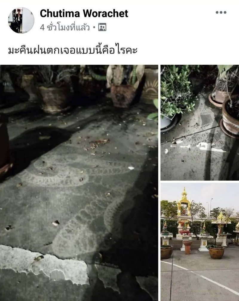 15 พฤษภาคม 2562 ผู้สื่อข่าวรายงานว่า โลกออนไลน์มีการแชร์เรื่องราวของผู้ใช้เฟซบุ๊กชื่อ Chutima Worachet ซึ่งได้เผยแพร่ภาพบริเวณหน้าศาลพระภูมิที่ทำงาน กับรอยประหลาดที่เกิดขึ้นหลังฝนตก โดยระบุข้อความว่า มะคืนฝนตกเจอแบบนี้คือไรคะ