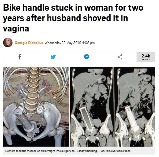 ทีมแพทย์ 19 คน ต้องใช้เวลานานกว่า 4 ชั่วโมง ในการนำการแฮนด์รถจักรยานยนต์ออกมาจากช่องคลอดของเธอ