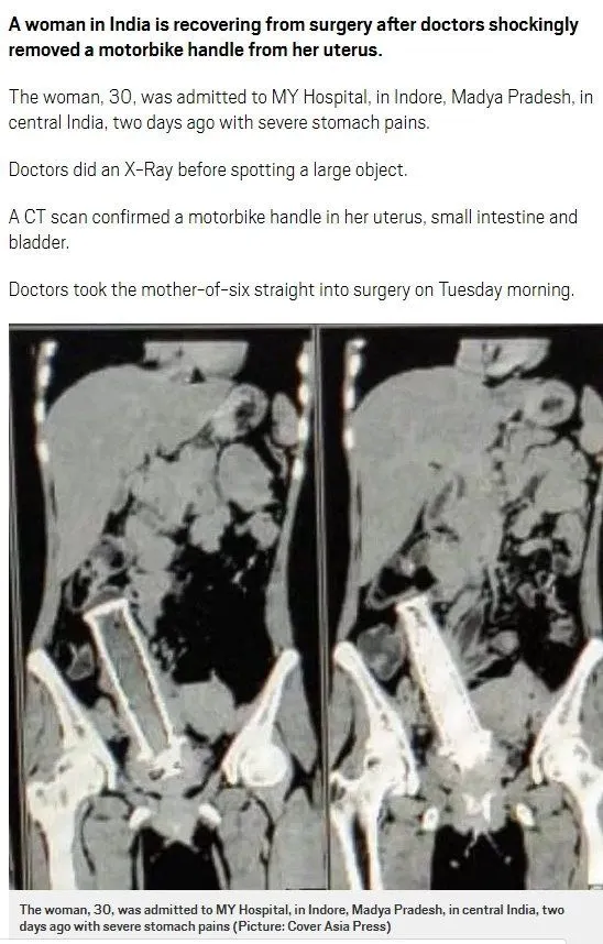 กลายเป็นเรื่องจริงสุดเศร้าที่เกิดขึ้นจริงกับชีวิตผู้หญิงคนหนึ่ง เมื่อเว็บไซต์ metro รายงานว่า หญิงอินเดีย วัย 30 ปี ถูกนำตัวส่งโรงพยาบาล MY เมืองอินดอร์ รัฐมัธยประเทศ ที่ตั้งอยู่ทางตอนกลางของประเทศอินเดีย หลังมีอาการปวดท้องอย่างรุนแรง