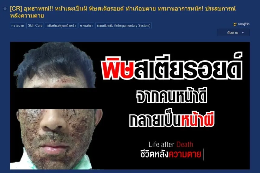 ถือเป็นอีกหนึ่งเรื่องราวอุทาหรณ์เตือนใจ ที่คนรักสวยรักงาม ทั้งผู้ชายและผู้หญิง ควรศึกษา เมื่อคุณ สมาชิกหมายเลข 986232 สมาชิกเว็บไซต์ Pantip.com ออกมาตั้งกระทู้ที่ชื่อว่า "[CR] อุทธาหรณ์!! หน้าเละเป็นผี พิษสเตียรอยด์ ทำเกือบตาย ทรมานอาการหนัก! ประสบการณ์หลังความตาย" บอกเล่าประสบการณ์ที่เจอมากับตัว ดังนี้