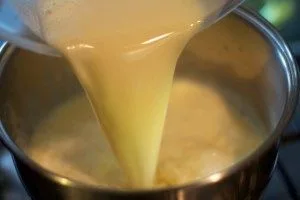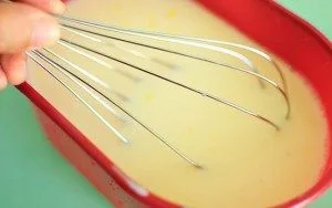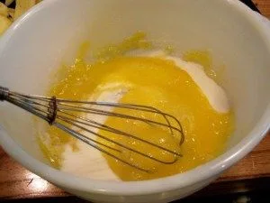 2.ใส่น้ำตาลลงในไข่แดงแล้วตีให้เป็นเนื้อเดียวกัน ค่อยๆ นำนมอุ่นเทใส่ลงไปทีละนิด แล้วตีให้ส่วนผสมเข้ากันทั้งหมด (นมต้องแค่อุ่นๆ นะคะ ห้ามร้อนเด็ดขาด เพราะถ้าร้อนเกินไปจะทำให้ไข่แดงสุกค่ะ)