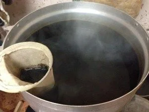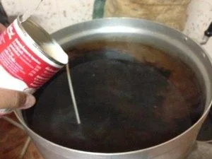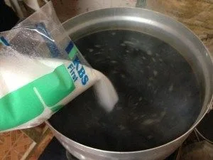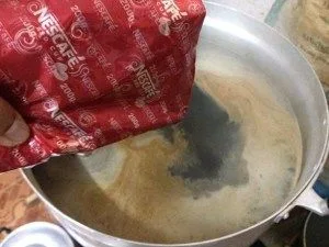 2.เมื่อน้ำที่เราชงกาแฟโบราณไว้เมื่อสักครู่เริ่มร้อนและสีน้ำเริ่มดำสนิทแล้วให้เรานำถุงชงกาแฟออก จากนั้นนำผงเนสกาแฟเทใส่ลงไปในหม้อประมาณ 100 กรัม (ครึ่งถุง) จากนั้นก็คนให้ผงกาแฟละลายเข้ากับน้ำ