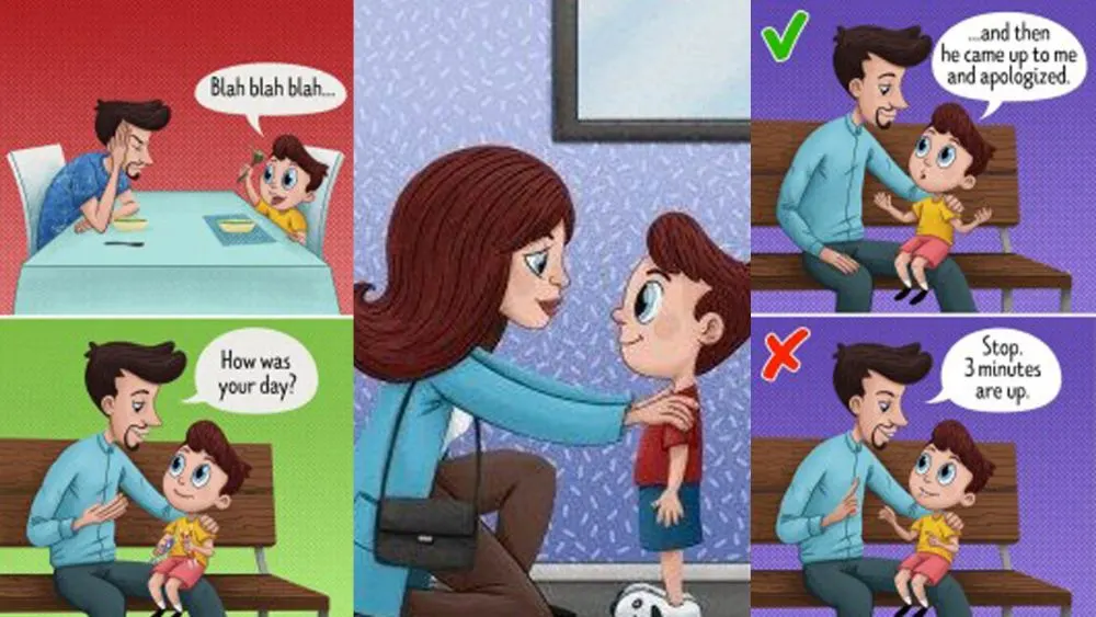 ให้คุณลดระดับของสายตาลงไปให้เสมอกับเด็กๆ ให้ความรักแก่พวกเขา จะด้วยการกอด จูบ หรือลูบหัวก็แล้วแต่ หลังจากนั้นให้ถามพวกเขาว่าเกิดอะไรขึ้นบ้างตอนที่คุณไม่อยู่ เป็นเวลาราวๆ 3 นาที โดยเฉพาะหลังจากกลับจากโรงเรียน หรือตอนคุณกลับมาจากงาน