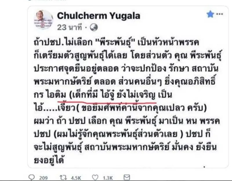 จากประเด็นก่อนหน้านี้ที่ทวิตเตอร์ของ หม่อมเจ้าจุลเจิม ยุคล ได้ทวีตข้อความพาดพิงไอติมว่า "ถ้า ปชป.ไม่เลือก "พีระพันธุ์" เป็นหัวหน้าพรรค ก็เตรียมหายไปได้เลย โดยส่วนตัว คุณ พีระพันธุ์ ประกาศจุดยืนอยู่ตลอด ว่าจะปกป้องรักษา สถาบัน พระมหากษัตริย์ ตลอด