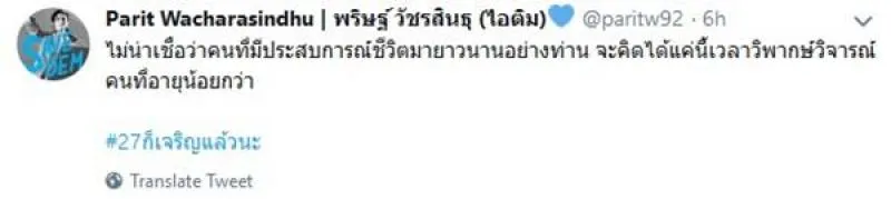 ไม่น่าเชื่อว่าคนที่มีประสบการณ์ชีวิตมายาวนานอย่างท่าน จะคิดได้แค่นี้เวลาวิพากษ์วิจารณ์คนที่อายุน้อยกว่า #27ก็เจริญแล้วนะ