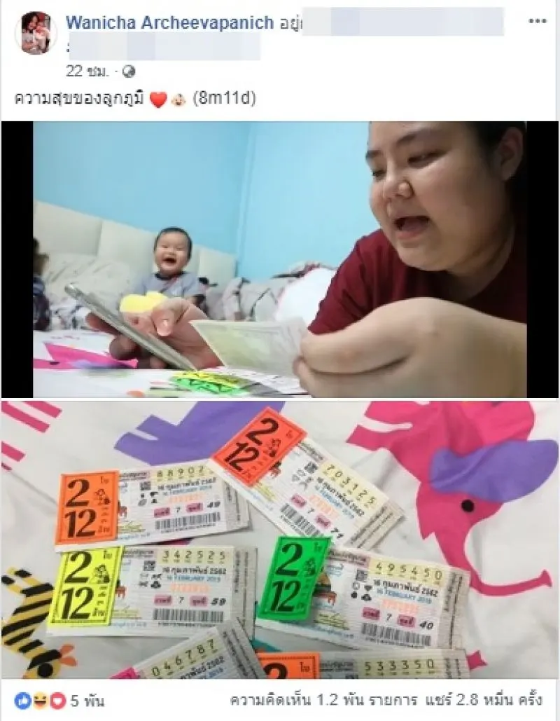 โดยคลิปดังกล่าวเผยให้เห็นคุณแม่ทำกำลังหยิบสลากฯขึ้นมาตรวจลางวัล โดยมีลูกน้อยคนหนึ่งที่กำลังนั่งมองแม่ด้วยความสงสัย แต่พอคุณแม่ตรวจใบที่ไม่ถูกเสร็จนั้น ลูกน้อยก็มีอาการ ที่ต้องบอกว่าน่าเอ็นดูสุดๆ