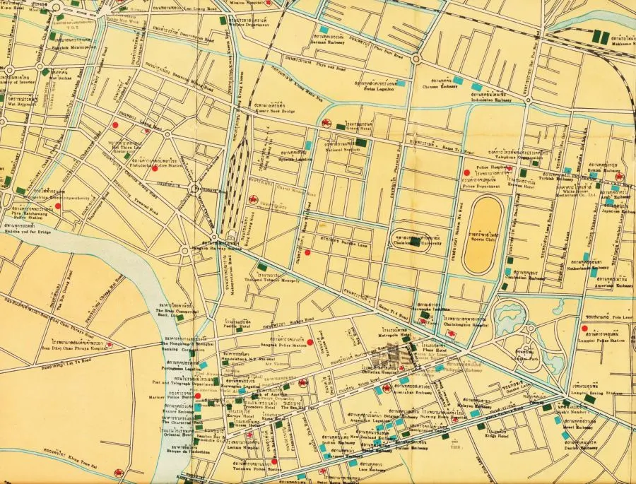 แผนที่และรายชื่อสถานฑูตรวมถึงที่ตั้งสายการบิน เป็นของยุคพุทธศักราช ๒๕๐๐ จะเห็นว่าส่วนใหญ่กระจุกตัวอยู่ในย่านนั้น ไกลสุดออกมาก็ถึงถนนเพชรบุรี (ไม่ตัดใหม่) ซึ่งในขณะนั้นถนนเพชรบุรีมีมาถึงแค่ซอยเอกมัยเท่านั้น ถือเป็นชานเมืองชนบทแล้ว