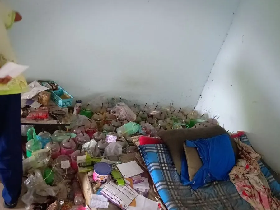 สงสัยเลยเปิดห้องเข้าไปดูก็เจอสภาพอย่างที่เห็น ถึงกับผงะ อ้วกแทบพุ่ง ขวดเหล้า เบียร์ แก้วน้ำ ถุงเท้า ฯลฯ รวมๆ กองเท่าหัวเข่า เหม็นสาบมาก ห้องน้ำนี่แห้งขอด ฝุ่นเต็มเลยอาบน้ำยังไงนี่งงมาก ภาพจริง ถ่ายเอง โอ๊ยจะเป็นลม