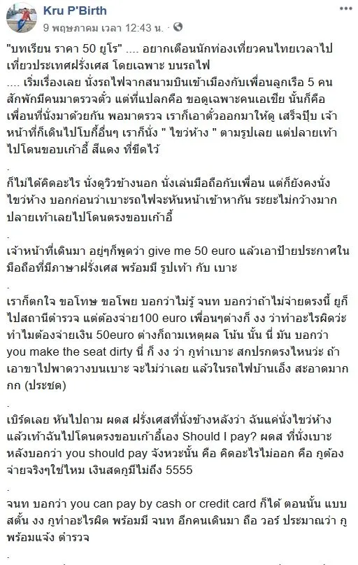 เรียกได้ว่าเป็นอีกหนึ่งที่ได้เผยแพร่ในโลกโซเชียลและเป็นอีกหนึ่งเรื่องราวที่ชาวเน็ตนั้นให้ความสนใจเป็นอย่างมาก เมื่อหนุ่มคนนึ่ง ที่ได้ใช้เฟสบุ๊คที่ชื่อว่า Kru P’Birth ได้ออกมาเผยแพร่เรื่องราวของตัวเองที่ได้พบเจอเหตุการณ์ด้วยตัวเอง โดยเจ้าของเฟสบุ๊คนั้นได้ระบุข้อความเอาไว้ว่า…”บทเรียน ราคา 50 ยูโร” …. อઈๅกเตือนนักท่องเที่ยวคนไทยเวลาไปเที่ยวประเทศฝรั่งเศส โดยเฉพาะ บนรถไฟเริ่มเรื่องเลย นั่งรถไฟจากสนามบินเข้าเมืองกับเพื่อนลูกเรือ 5 คน สักพักมีคЊಖาตรวจตั๋ว แต่ที่แปลกคือ ขอดูเฉพาะคนเอเชีย นั้นก็คือเพื่อนที่นั่งมาด้วยกัน พอมาตรวจ เราก็เอาตั๋วออกมาให้ดู เสร็จปุ๊บ เจ้าหน้าที่ก็เดินไปโบกี้อื่นๆ