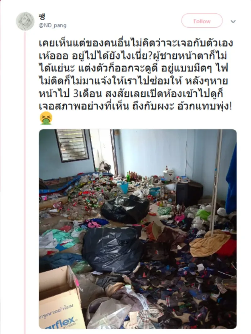 วันที่ 17 พฤษภาคม 2562 ผู้สื่อข่าวรายงานว่า โลกออนไลน์ใน twitter ได้มีการแชร์เรื่องราวของสมาชิกชื่อ @ND_pang ซึ่งได้โพสต์เล่าเหตุการณ์ที่เจอมากับตัว เกี่ยวกับการเช่าห้อง โดยระบุข้อความว่า เคยเห็นแต่ของคนอื่นไม่คิดว่าจะเจอกับตัวเอง เห้อออ อยู่ไปได้ยังไงเนี่ย?ผู้ชายหน้าตาก็ไม่ได้แย่นะ แต่งตัวก็ออกจะดูดี อยู่แบบมืดๆ ไฟไม่ติดก็ไม่มาแจ้งให้เราไปซ่อมให้ หลังๆหายหน้าไป 3 เดือน สงสัยเลยเปิดห้องเข้าไปดูก็เจอสภาพอย่างที่เห็น ถึงกับผงะ อ้วกแทบพุ่ง!