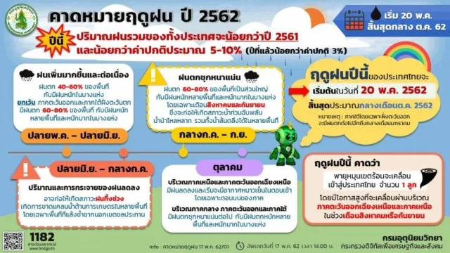 กรมอุตุฯ ออกประกาศ การเข้าสู่ฤดูฝนอย่างเป็นทางการ พ.ศ. 2562 โดยระบุว่า ฤดูฝนของประเทศไทยปีนี้ จะเริ่มขึ้นในวันที่ 20 พฤษภาคม พ.ศ. 2562