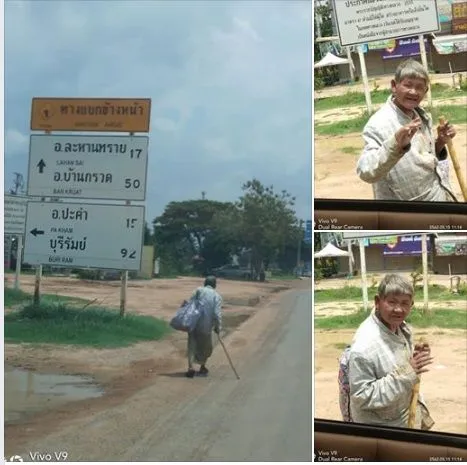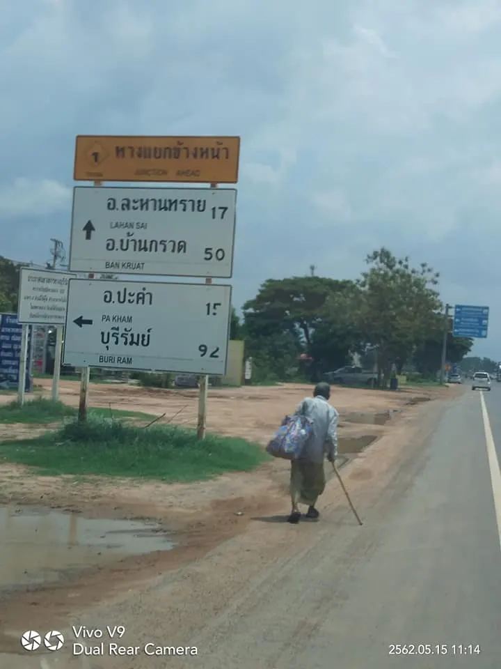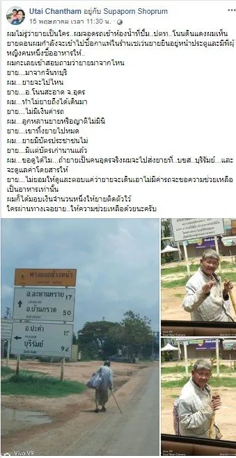 ในเพจผู้ใช้นามว่า "Utai Chantham" ได้แชร์ภาพยายท่าทางน่าสงสาร พร้อมคำตอบว่าเดินเท้าจากจันทบุรีมาถึงบุรีรัมย์