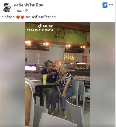 ยุคสมัยเปลี่ยนไปใจคนก็เปลี่ยนการที่เราจะหาใครสักคนมาร่วมชีวิตก็ไม่ใช่เรื่องง่ายกว่าจะเจอคนที่รักเราโดยไม่หวังอะไรจากเราก็ยากแต่สำหรับคนสมัยก่อนมีความรักที่ยืนยาวและล่าสุดทางเพจตะลึง ทั่วโซเชียล ก็ได้โพสต์คลิปสองตายายที่มาทานอาหารที่ฟู๊ดคอร์ดแถมป้อนข้าวกันกระหนุงกระหนิงใครเห็นก็ต้องอิจฉายายเพราะตาน่ารักมากถึงแม้ว่ายายจะแก่แต่ตาก็ไม่เคยรักยายน้อยลงเลยน่ารักอ่ะอิจฉ่เลยเนี่ย พร้อมระบุข้อความว่า น่าร๊ากก คุณตาป้อนข้าวยาย