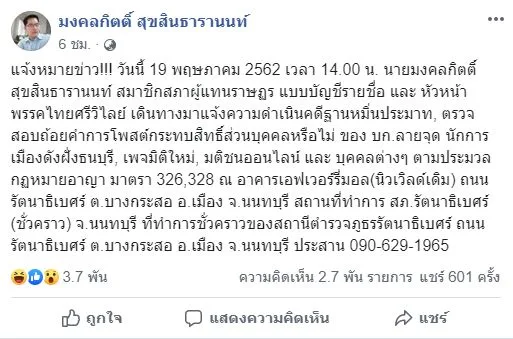 ล่าสุดวันที่ 19 พฤษภาคม 2562 นายมงคงกิตติ์ได้แจ้งว่า เวลา 14.00 น. นายมงคลกิตติ์ สุขสินธารานนท์ สมาชิกสภาผู้แทนราษฏร แบบบัญชีรายชื่อ และ หัวหน้าพรรคไทยศรีวิไลย์ เดินทางมาแจ้งความดำเนินคดีฐานหมิ่นประมาท, ตรวจสอบถ้อยคำการโพสต์กระทบสิทธิ์ส่วนบุคคลหรือไม่ ของ บก.ลายจุด นักการเมืองดังฝั่งธนบุรี, เพจมิติใหม่ ฟ้องสื่อ และ บุคคลต่างๆ