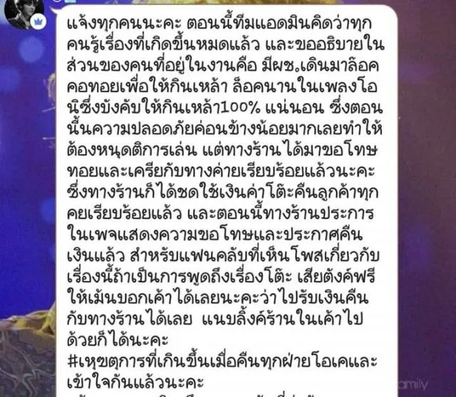 โดยหนุ่มที่ขึ้นไปบนเวทีได้ใช้เงินบังแก้วเอาไว้ทำให้หลายคนไม่รู้ และเข้าใจผิดว่าขึ้นไปให้ทิป ซึ่งมีแฟนคลับสามารถถ่ายภาพอีกมุมเอาไว้ได้ หลังจากที่ได้มีการเผยแพร่คลิปออกไปก็กลายเป็นที่วิจารณ์อย่างมาก ถึงความไม่เหมาะสมของเหล่าแฟนคลับบางคน ที่มักจะมีความเข้าใจแบบผิดๆ ทั้งนี้เบื่องต้นทางด้านเจ้าของร้านได้คืนเงินค่าโต๊ะให้กับแฟนคลับที่มาร่วมงาน ซึ่งทุกฝ่ายได้เคลียร์กันเป็นที่เรียบร้อยแล้ว