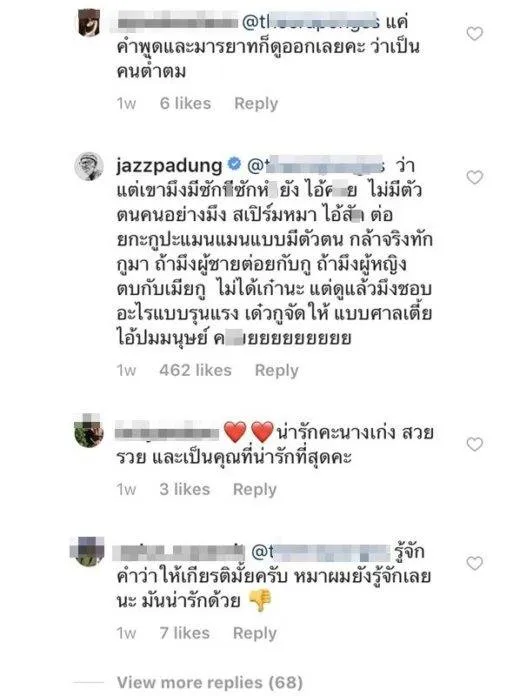 “คนที่รักเราไม่แฮปปี้เข้ามาด่าให้เต็ม เช่น แจ๊ส ชวนชื่น คุณหมออีกหลายคน เข้ามาด่าให้เต็มเลย 500 กว่าข้อความ เขาก็เงียบไปไม่กล้าสวนเลย แจ๊ส ชวนท้าต่อย เขาคงไม่แฮปปี้ที่มาทำกับผู้หญิงแบบนี้ ต้องขอบคุณน้อง และหลายๆคนด้วย ที่เข้ามาด่าให้”