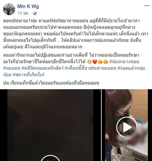 เมื่อวานนี้ (19 พฤษภาคม 2562) ผู้ใช้เฟสบุ๊ค Min K Wg ได้โพสต์เรื่องราวสุดประทับใจ เมื่อมีผู้หญิงคลอดลูกกลางถนน และได้มีคนเข้ามาขอความช่วยเหลือ สัตวแพทย์สาว ที่ชื่อคุณหมอมน และทางคุณหมอได้ให้ความช่วยเหลืออย่างเต็มที่ ทำเอาชาวเน็ตชื่นชมเป็นจำนวนมาก โดยระบุข้อความว่า