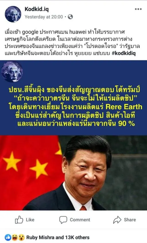 สีจิ้นผิง ปธน.จีน ไปเยี่ยมชมโรงงานผลิตแร่แรร์เอิร์ธ และจีนเป็นผู้ผลิตในสัดส่วนถึง 90% ของโลก และสหรัฐนำเข้าแร่ตัวนี้จากจีนถึง 80% จากปริมาณนำเข้าทั้งหมด