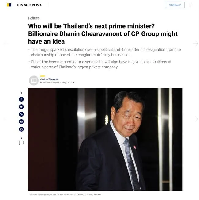 หนังสือพิมพ์ชื่อดังของฮ่องกง ได้เผยแพร่บทความพิเศษในคอลัมน์ This Week In Asia ในชื่อว่า Who will be Thailand's next prime minister ? Billionaire Dhanin Chearavanont of CP Group might have an idea หรือแปลได้ว่า ใครจะได้เป็นนายกรัฐมนตรีคนใหม่ของประเทศไทย ? ธนินท์ เจียรวนนท์ ประธานเครือเจริญโภคภัณฑ์ อาจมีคำตอบ