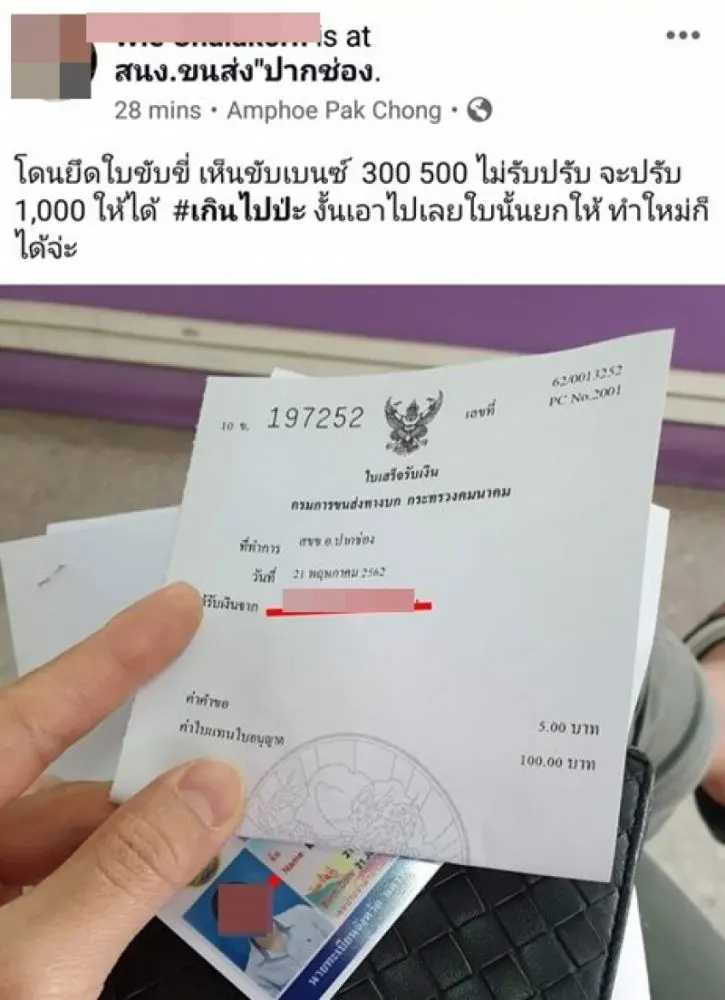 เฟซบุ๊กเพจ เฮีย ได้เเชร์เรื่องราวสาวหล่อคนหนึ่งโดนเจ้าหน้าที่ตำรวจยึดใบขับขี่ เเต่ไม่ยอมให้ปรับ 300-500 เเต่จะขอปรับ 1,000 บาทเพราะเห็นว่าเธอขับรถเบนซ์ เธอจึงไปติดต่อขอทำใบขับขี่ใหม่ พร้อมโพสต์ภาพใบขับขี่ใหม่พร้อมเงินผ่านเฟซบุ๊กส่วนตัว ระบุข้อความไว้ว่า โดนยึดใบขับขี่เห็นขับเบนซ์ 300-500 ไม่ปรับ จะปรับ 1,000 ให้ได้ #เกินไปปะ งั้นเอาไปเลยใบนั้นยกให้ ทำใหม่ก็ได้จ้า