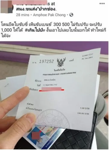 พร้อมโพสต์ภาพใบขับขี่ใหม่พร้อมเงินผ่านเฟซบุ๊กส่วนตัว ระบุข้อความไว้ว่า โดนยึดใบขับขี่เห็นขับเบนซ์ 300-500 ไม่ปรับ จะปรับ 1,000 ให้ได้ #เกินไปปะ งั้นเอาไปเลยใบนั้นยกให้ ทำใหม่ก็ได้จ้า หลังจากที่เรื่องราวนี้ได้เผยแพร่ออกไปนั้นก็มีชาวเน็ตนั้นเข้ามาคอมเม้นเป็นจำนวนมาก