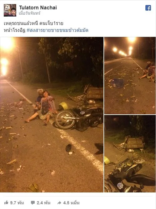 จากกรณีที่มีผู้ใช้เฟสบุ๊กชื่อ Tulatorn Nachai ได้โพสต์ภาพสุดหดหู่ เป็นหญิงสูงอายุถูกรถชนได้รับบาดเจ็บ ข้าวของกระจัดกระจายเกลื่อนพื้นถนน โดยมีคุณตาซึ่งเป็นสามีนั่งประคองตัวคุณยายไว้ พร้อมระบุข้อความว่า “เหตุรถชนแล้วหนี คนเจ็บ 1 ราย หน้าโรงอิฐ #สงสารยายขายขนมข้าวต้มมัด” เมื่อช่วงค่ำของวันที่ 21 พ.ค. ที่ผ่านมา