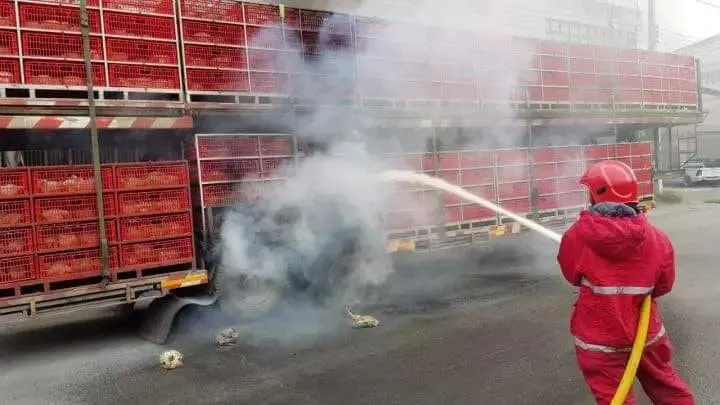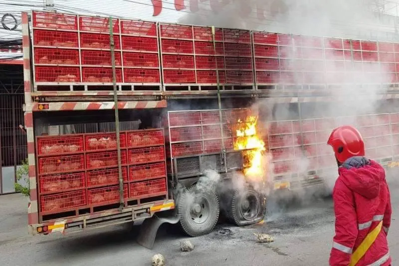 ไฟลุกลามอย่างรวดเร็ว ไฟไหม้ล้อรถ แล้วลามขึ้นไปไหม้กล่องบรรจุไก่ เผาไก่ทั้งเป็น กว่า 200 ตัว กลิ่นไก่ย่างฟุ้งกระจายไปทั่ว บางตัวกล่องแตก กระโดดหนีตาย ออกมาวิ่งอยู่บนถนน