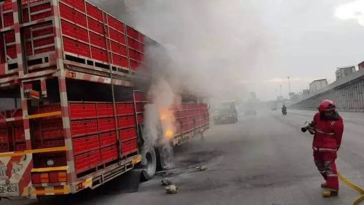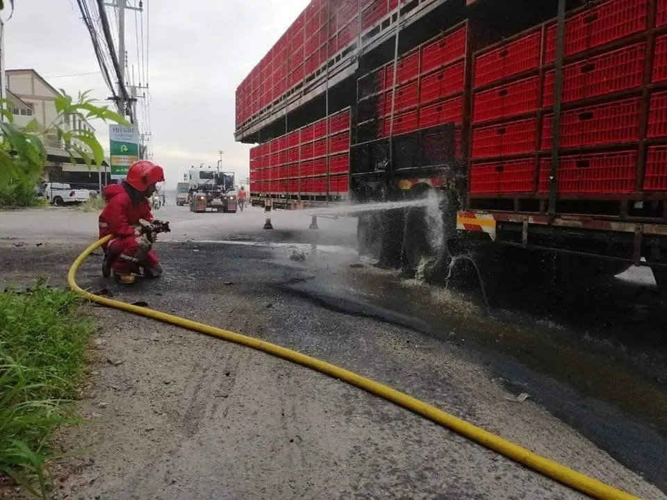 ***รถบรรทุกพ่วง 18 ล้อ บรรทุกไก่เป็นมาเต็มคันจำนวน 4,500 ตัว เพื่อนำส่งเข้าที่บริษัท กรุงเทพ เกิดเพลิงลุกไหม้ คร่าชีวิตไก่นับร้อยตัว***