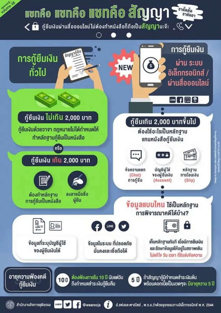 เรื่องน่ารู้จาก สำนักงานกิจการยุติธรรม ได้ให้ความรู้เกี่ยวกับ “แชทคือ แชทคือ แชทคือ สัญญา” ซึ่งนับว่าเป็นสัญญาการกู้เงินโดยไม่จำเป็นต้องลงลายลักอักษร ซึ่งโดยปกติตามกฎหมายว่าไว้กู้เงินไม่เกิน 2,000 บาท ไม่จำเป็นต้องมีหลักฐานก็ได้ แต่สำหรับยอดเงินเกิน 2,000 บาท ต้องทำเป็นหนังสือลงลายมือชื่อ เพื่อใช้เป็นหลักฐานในการฟ้องคดีตามกฎหมาย