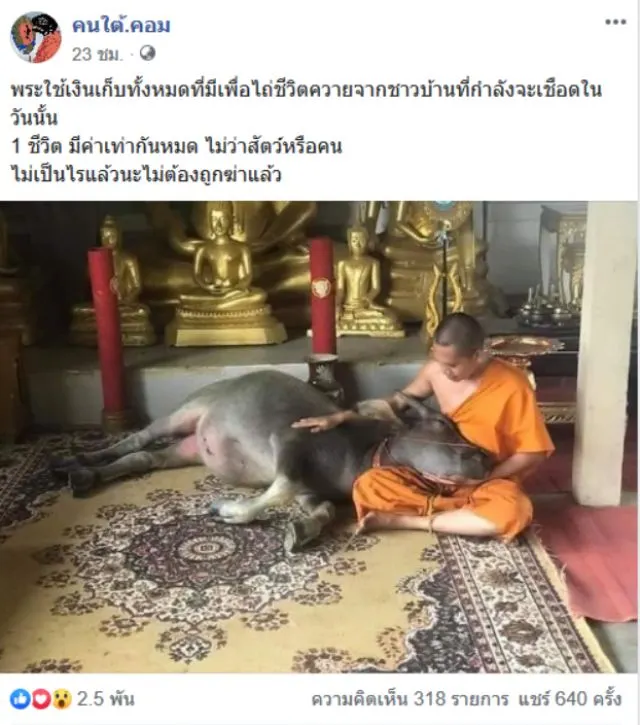 ต้องบอกเลยว่าเป็นอีกหนึ่งเรื่องราวที่ชาวเน็ตแห่แชร์ และให้ความสนใจกันเป็นจำนวนมาก เมื่อมีผู้ใช้เฟสบุ๊คชื่อ คนใต้.คอม ได้โพสต์เรื่องราวของพระท่านหนึ่ง ที่ใช้เงินเก็บทั้งหมดที่มี เพื่อไถ่ชีวิตควายจากชาวบ้านที่กำลังจะเชือดในวันนั้น 1 ชีวิต โดยได้รถบุว่า...