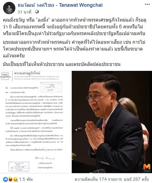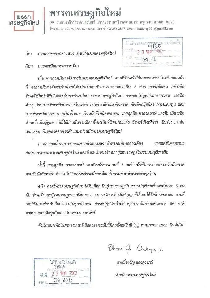 ด่วน! มิ่งขวัญ ประกาศลาออกจากตำแหน่งหัวหน้าพรรคเศรษฐกิจใหม่
