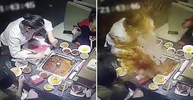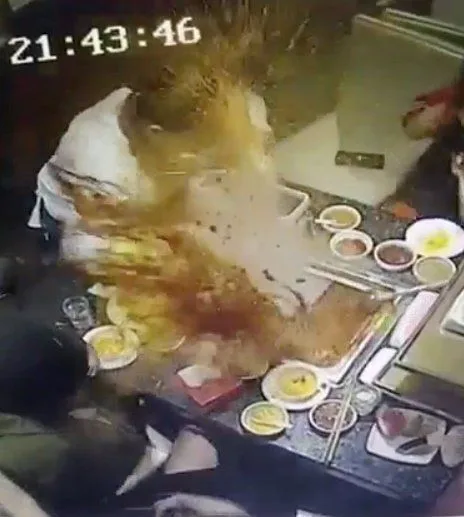 ภาพจากกล้องวงจรปิด ที่ตอนนี้กลายเป็นที่โด่งดังในโลกโซเชียลเผยให้เห็นว่า พนักงานหญิงดังกล่าวพยายามวนหาไฟแช็คในหม้อไฟที่เต็มไปด้วยน้ำมันพริกเผ็ดร้อนให้ลูกค้า จนกระทั่งจู่ๆหม้อไฟเกิดระเบิดใส่หน้าเธอเต็มๆ รวมไปถงลูกค้า 2 รายได้ถูกแรงระเบิดทำให้โดนน้ำร้อนลวกไปเล็กน้อย ส่วนพนักงานหญิงโดนระเบิดใส่หน้าเข้าเต็มๆและให้ปวดแสบปวดร้อนมาก ก่อนถูกนำส่งโรงพยาบาลอย่างรวดเร็ว