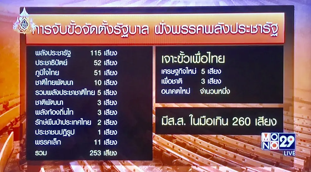 24 พ.ค.62 มีรายงานข่าวจากพรรคพลังประชารัฐ (พปชร.)เปิดเผยถึงความคืบหน้าในการจัดตั้งรัฐบาลที่มีพรรคพลังประชารัฐเป็นแกนนำ โดยล่าสุด หลังจากนายมิ่งขวัญ แสงสุวรรณ์ ลาออกจากหัวหน้าพรรคเศรษฐกิจใหม่แล้ว ส.ส.ของพรรคจำนวน 5 คน มีแนวโน้มจะหันมาสนับสนุนพรรคพลังประชารัฐจัดตั้งรัฐบาล ทำให้เมื่อรวมเสียงทั้งหมดแล้วจะได้ 257 เสียง และมีแนวโน้มสูงอีกเช่นกันว่า จะมี ส.ส.จากพรรคเพื่อชาติบางส่วนประมาณ 2-3 เสียง เข้ามาสนับสนุนพรรคพลังประชารัฐ ทำให้จำนวน ส.ส.ที่สนับสนุนรัฐบาลอยู่ที่ 259-260 เสียง