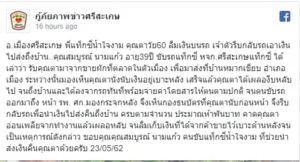 เรียกได้ว่าเป็นอีกหนึ่งเรื่องราวที่น่าชื่นชมและยกย่องเป็นอย่างมาก เพจเฟซบุ๊ก “กู้ภัยภาพข่าวศรีสะเกษ” ได้มีการโพสต์เรื่องราวความดี ของหนุ่มขับแท็กซี่คนหนึ่งโดยระบุว่า