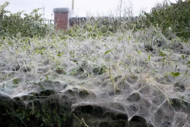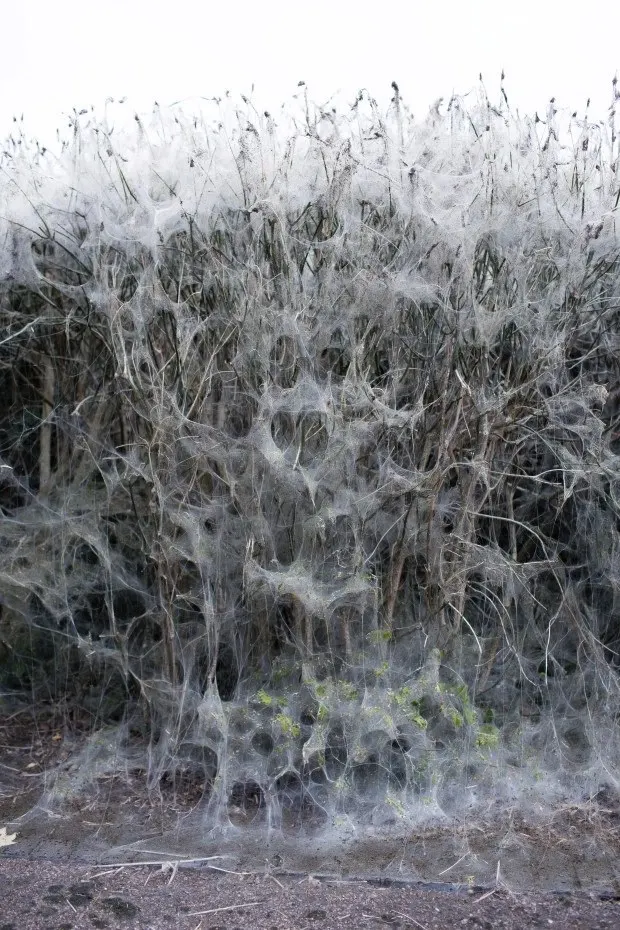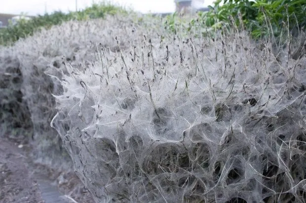 กำแพงและพุ่มไม้ถูกปกคลุมด้วยใยสีขาวโพลน