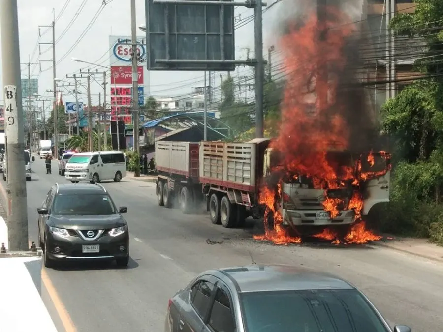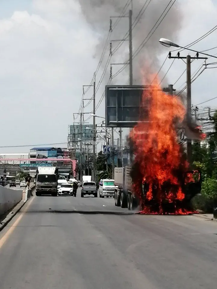 จากการสอบถาม หนุ่มคนขับ 18 ล้อ ทราบว่า ระหว่างตนกำลังขับอยู่นั้น จู่ๆได้เกิดไฟลุกท่วมบริเวณห้องเครื่องอย่างรวดเร็ว โดยไม่ทราบสาเหตุ จึงตัดสินใจอุ้มแมวที่เลี้ยงไว้วิ่งหนีตายลงมาจากรถบรรทุกและโทรเเจ้งดับเพลิง ก่อนจะยืนถ่ายภาพรอรถดับเพลิงเข้าควบคุมเพลิง