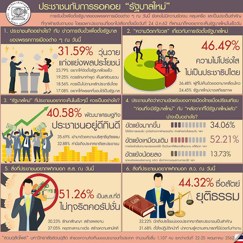 “สวนดุสิตโพล” เผย ปชช. มองการจัดตั้งรัฐบาลวุ่นวาย แก่งแย่งผลประโยชน์ อยากเห็นรัฐบาลใหม่ได้คนดี