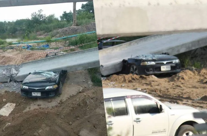 โดยทางบริษัทผู้รับหมาได้สร้างสะพานข้ามสระน้ำขนาดใหญ่เชื่อมต่อกับสะพานข้ามถนน นิคมลำตะคอง และสร้างได้ทำการเสาตอหม้อสะพานเสร็จแล้ว แต่ขณะที่รถเครนจำนวน 2 คัน กำลังช่วยกันยกคานสะพานขนาดใหญ่เพื่อนำขึ้นไปพาดตอหม้อที่สร้างเสร็จแล้ว ทันใดนั้น คานสะพานได้หลุดจากลวดสลิงที่ใช้ยกร่วงลงมาด้านล่างทับรถยนต์เก๋ง ยี่ห้อ มิตซูบิชิ สีดำ หมายเลขทะเบียน กฉ-3312 แพร่ ซึ่งเป็นรถของคนงานก่อสร้างที่จอดอยู่บริเวณนั้น พังยับ ขาด 2 ท่อน คนงานก่อสร้างที่กำลังทำงานอยู่ต่างพากันกระโดดหนีตายกระเจิงไปกันคนละทิศละทางแต่โชคดีที่ไม่มีใครได้รับบาดเจ็บและภายในรถไม่มีคนงานอยู่