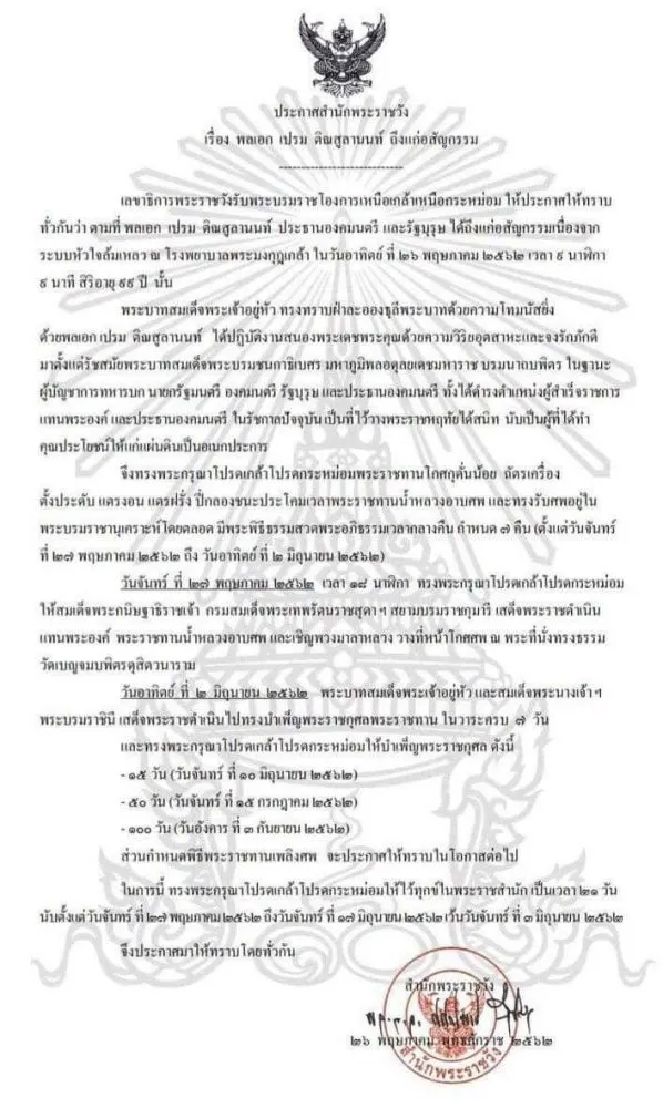 เลขาธิการพระราชวังรับพระบรมราชโองการเหนือเกล้าเหนือกระหม่อม ให้ประกาศให้ทราบทั่วกันว่า ตามที่ พลเอก เปรม ติณสูลานนท์ ประธานองคมนตรี และรัฐบุรุษ ได้ถึงแก่อสัญกรรมเนื่องจากระบบหัวใจล้มเหลว ณ โรงพยาบาลพระมงกุฎเกล้า ในวันอาทิตย์ 26 พฤษภาคม 2562 เวลา 9 นาฬิกา 9 นาที สิริอายุ 99 ปี นั้น