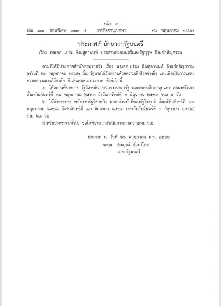 ให้ลดธงครึ่งเสา ข้าราชการ ไว้ทุกข์ 21 วัน พลเอก เปรม ติณสูลานนท์