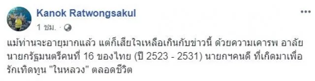 ล่าสุด Kanok Ratwongsakul โพสต์ข้อความระบุว่า แม้ท่านจะอายุมากแล้ว แต่ก็เสียใจเหลือเกินกับข่าวนี้ ด้วยความเคารพ อาลัย นายกรัฐมนตรีคนที่ 16 ของไทย (ปี 2523 - 2531) นายกฯคนดี ที่เกิดมาเพื่อรักเทิดทูน "ในหลวง" ตลอดชีวิต