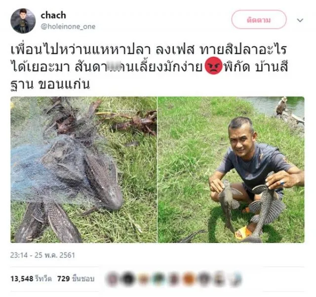 ภาพเหตุการณ์ต่อไปนี้ถูกเผยแพร่จากทวิตเตอร์คุณ holeinone_one เมื่อวันที่ 25 พ.ค. ที่ผ่านมา โดยเจ้าของทวิตเตอร์รายนี้ เผยข้อความไว้ว่า “เพื่อนไปหว่านแหหาปลา ลงเฟส ทายสิปลาอะไร ได้เยอะมา สันดา_คนเลี้ยงมักง่าย พิกัด บ้านสีฐาน ขอนแก่น”